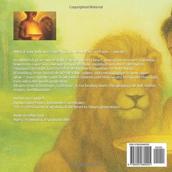 In a peaceful village full of golden light, a little girl named Liora holds a magical bowl of her inner light. With the gentle strength of a lion friend beside her, she discovers the meaning of guarding her light, sharing her light with others, and listen to the whispers of her soul.
